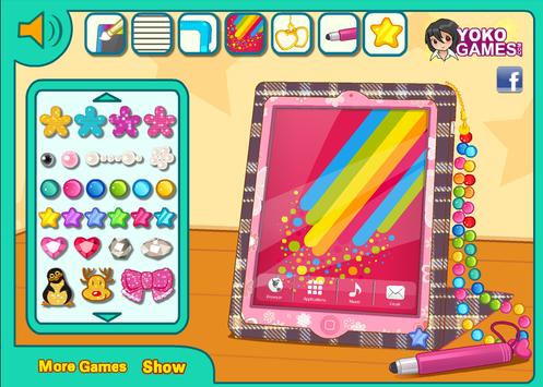 There are 7 icons at the top of the screen which include Ipad color, Ipad pattern, case color, screen design, accessories, stylist pen design, and finishing touches. The aim of this game is to mix, match and simply dress up Ipad in a fun and colorful way.