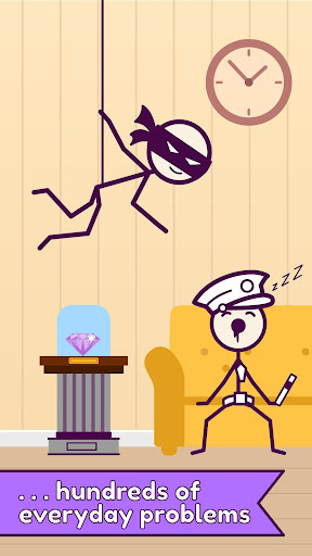 Stick man is a bad guy. He is going to destroy things. Make a physics drop to drop the ball and break the glasses to stop him.