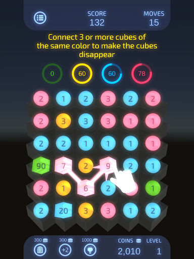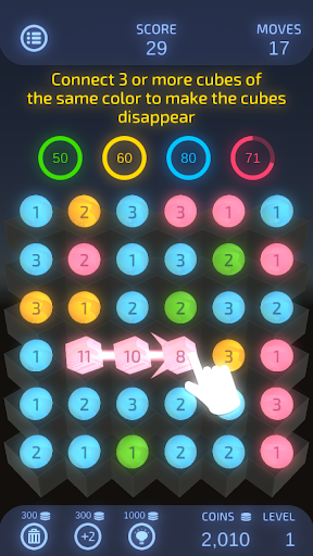 When 3 or more cubes of the same color are connected, you win the points and the cubes are removed.