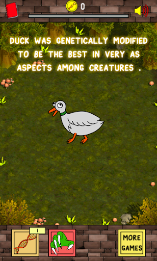 The alien would like to evolve the duck to do everything the best in swimming , diving , flying and running . The aliens built up and did recombinant DNA of the duck with other animal; eagle , cheetah, alpaca , goat and so on but the experiment was not successful . The duck is still a duck and it lives in general . The aliens decided to leave the duck in the forest on the island without knowing that the genetically modification will be affected when the duck eats and absorbs DNA of other creatures . At first the duck can only hunt small creatures like shrimp and crab but when it has the ability to evolve to larger size , it is possible to hunt more for evolving itself to become the ultimate form and be the best in every aspects . .