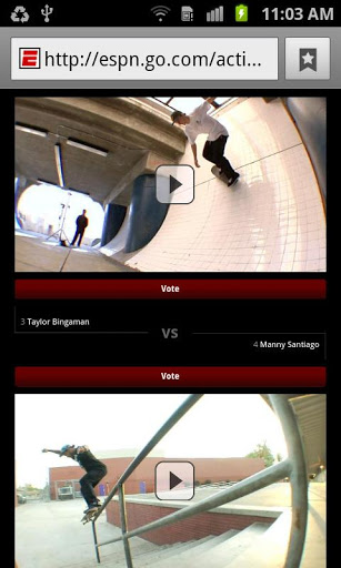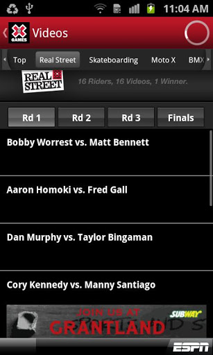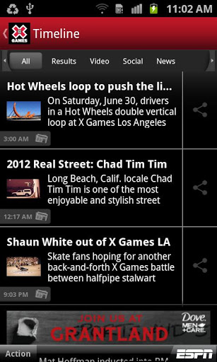 ESPN X Games L.A. 2012The allnew X Games app for Android puts the worlds most exciting action sports competition right at your fingertips with blazing video highlights, instant results, personalized schedules an interactive dashboard and the ability to watch the telecast live on your device via the WatchESPN app. Download this FREE app todayFEATURES Video Highlights: Watch all the best runs, tricks, crashes and clips from X Games, then share them quickly and easily with your friends Instant Results: Gold, silver, bronze and everything else all on your mobile device and from every exciting competition Personalized Schedules: Detailed calendars and reminders for every X Games event, whether youre viewing in person or watching from home Live Timeline: Your onestop shop for X Games news, results, videos, tweets, Facebook updates, editorial messages more Real Street: Use the app to watch and compare videos from every round of the Real Street video contest. Dont forget to vote for your favorite WatchESPN: Watch the telecast LIVE on your device via the WatchESPN app News: Get the inside scoop on X Games happenings while keeping up with breaking news from around the world of action sports Athlete Bios: Everything you ever wanted to know about your favorite X Games athletes, including their competition history and tunein information X Cast: Watch live streaming webcasts, athlete chats and more throughout X Gamessocial media Keep up with the chatter around the X Games with Facebook, Twitter and GroupMe integration Guest Info: Use the app to get around the venue, find parking, take advantage of X Fest, and learn about other X Games services Ticketing: Use the builtin Ticketmaster integration to buy tickets to X Games