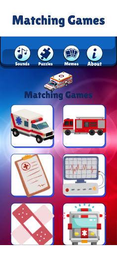 But the Kids Emergency Games Free 🚑: 911 Ambulance Doctor don't end there. The activity app includes a beautiful collection of emergency games for kids like puzzle games for kids, fun matching games with memory cards, and funny siren sounds.
