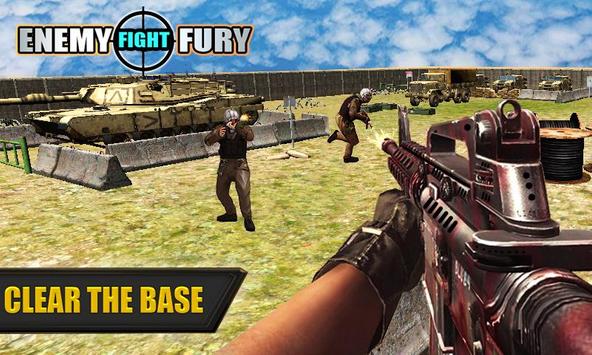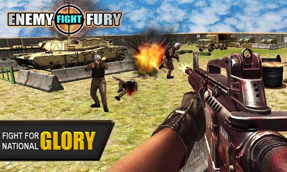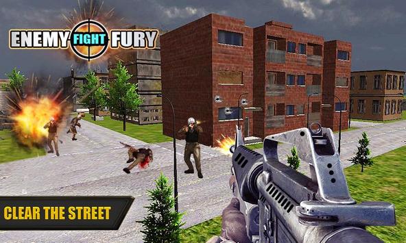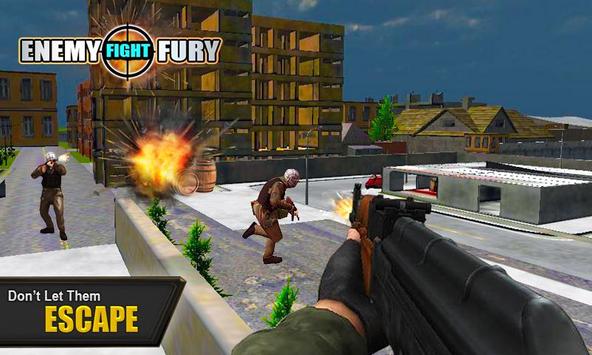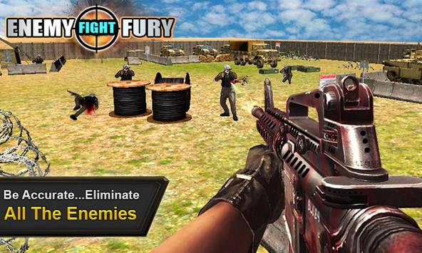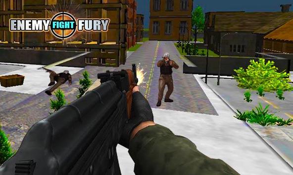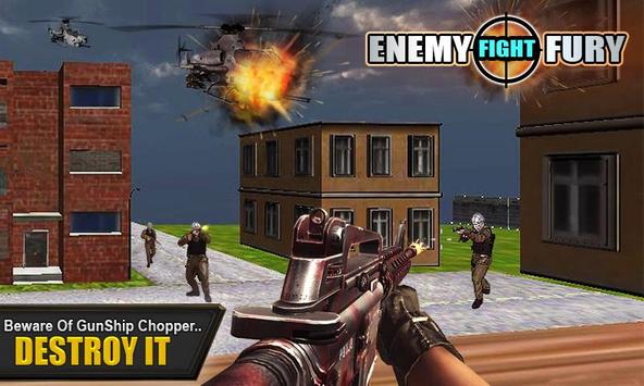Enemy Fight Fury is a survival operation of an army commando for his country. Enemy's army have invaded our peripheral city and have taken over the control of city.This battle can't be fought openly due to enemy's strategical maneuvers that enemy have spread the fire of war at all our surrounding borders and most of our army's heavy ammunition such as missiles, air combat with heavy bombardment of jets and gunship helicopters, artillery vessels and tanks are involved at other borders. You have to show legendary expertise to over come enemy's maneuvers and destroy their cantonment. During rescue mission most of our commandos have been shoot by enemy's roaring guns and you are the only hope to vacate the city. You are at camouflaged position to shoot limited magazines with assault guns. Your shooting capacity will be increased with your skills, higher the score more lethal weapon will be in selection options. In weapon option you have variety of small but guns of modern era. So player must have passion to shoot till death and have to dare to contain the enemy troops as city is under the siege of insurgents and enemy army . You have to succeed in this covert gorilla operation and destroy their stronghold. In game play there are two game scenes you have to target enemy's in city and in other you have to fight in cantonment area but remember in both area you have to neutralize the enemy's territorial control.