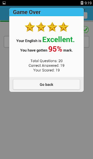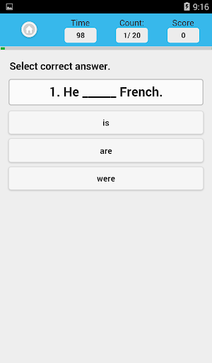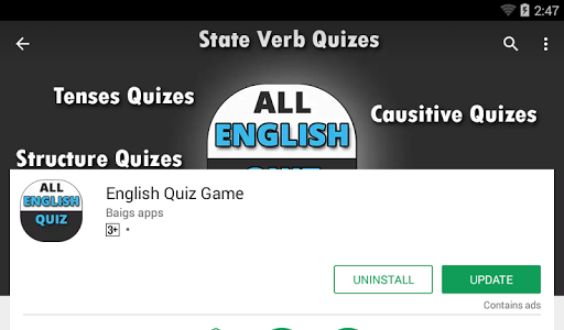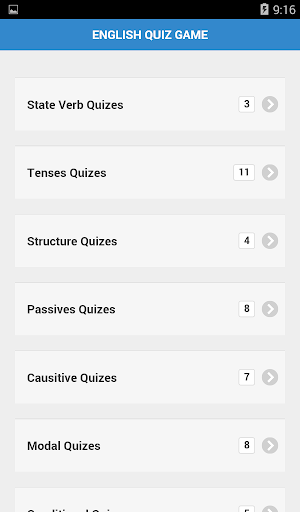 English Quiz Game is very useful app for new English learner Basic to Advance. It has Tenses, State Verb, Structure, Passive, Causitive, Modals, Conditionals Quiz.