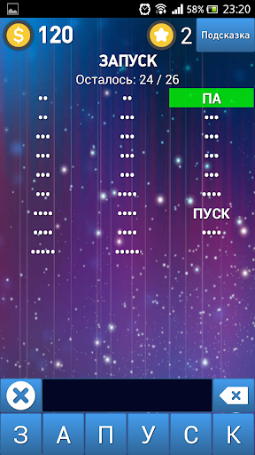 * Words that can be entered - nouns , adjectives and verbs . You will be able to learn the meaning of each word. Also, for each word you get points for that later you can get a clue. Аor each tour you get 100 points , raising the level and ability to hit the leader board!