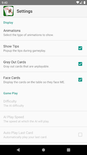 - Display options: Animations, Show Tips, Gray Out Cards, Face Cards