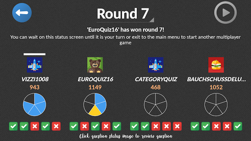 Multiplayer games can take place with up to 4 players. A round consists of 5 questions that has to be answered within 30 seconds per question. During a round you have always the chance to answer all 5 questions even if you fail to give a correct answer for a question. The 5 questions have ascending scores from 100 to 500. In addition to the score for a correctly answered question you get 3 extra-points for every remaining second.