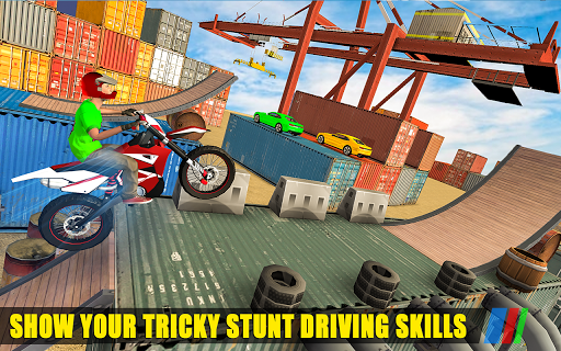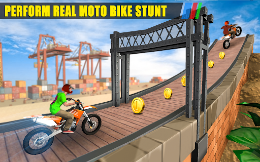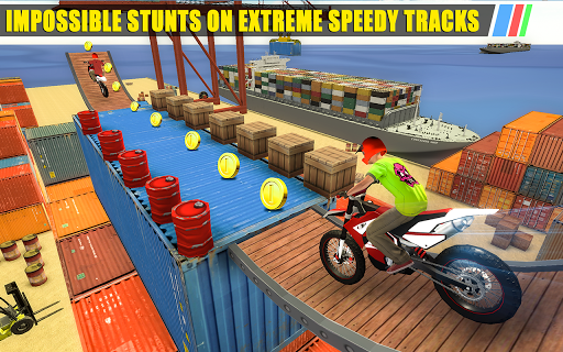 The faster you ride, the more scores you get. Complete tracks with super extreme jumping stunts in time. Careful around corners while performing stunts collect as much as coins more coins you collect you get more bonus points you receive. Use nitro to boost performance to perform somersaults and ramp stunts, jump over containers, riding on wood planks, barrels, crates and much more.