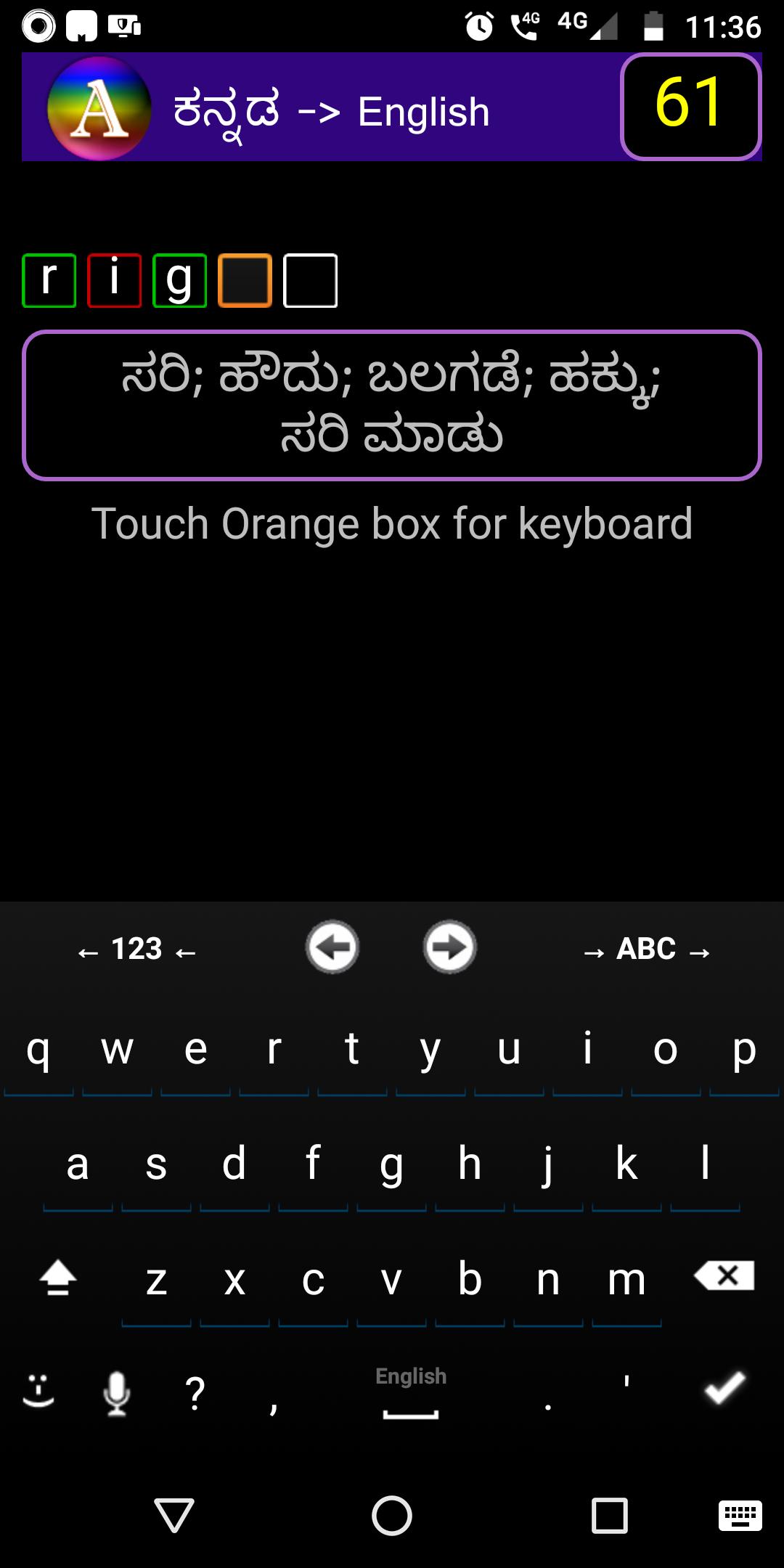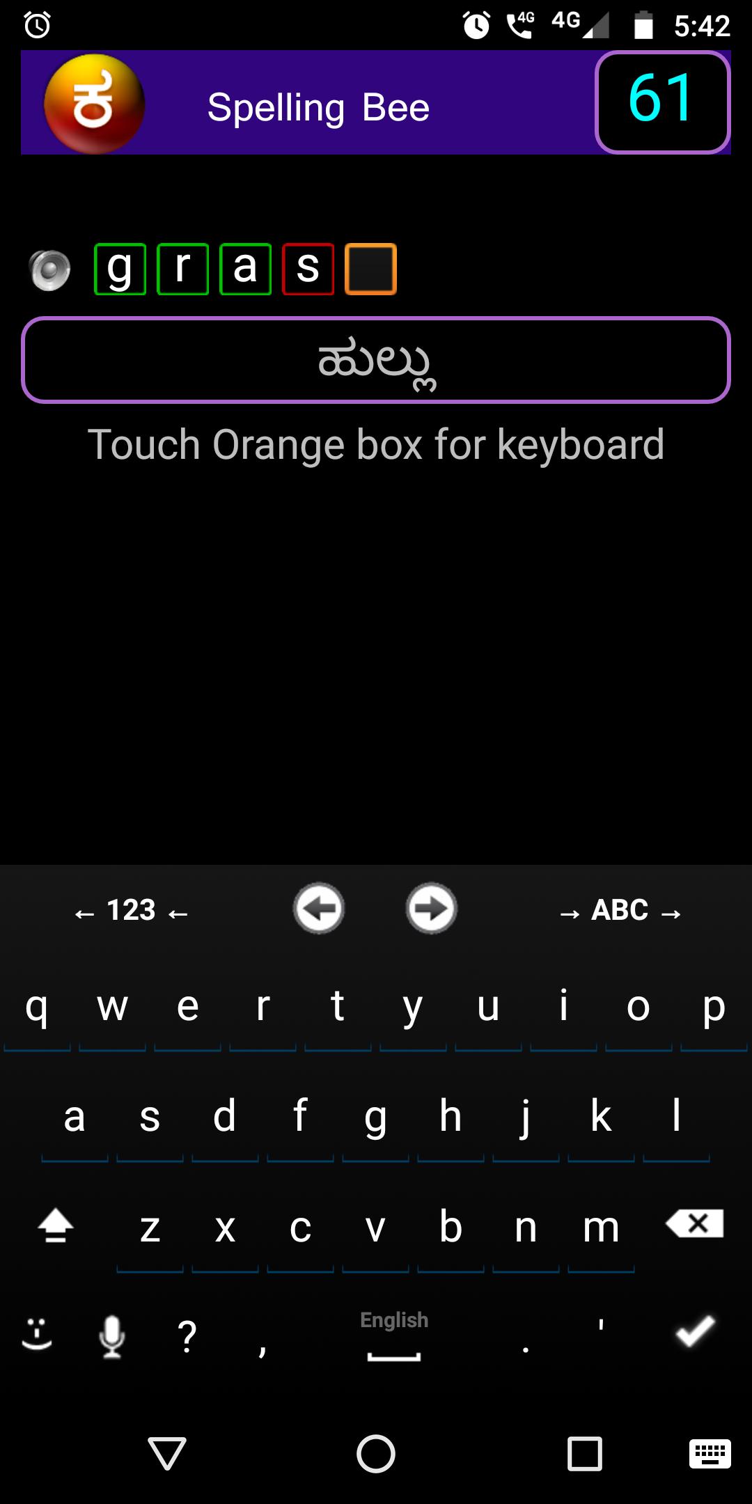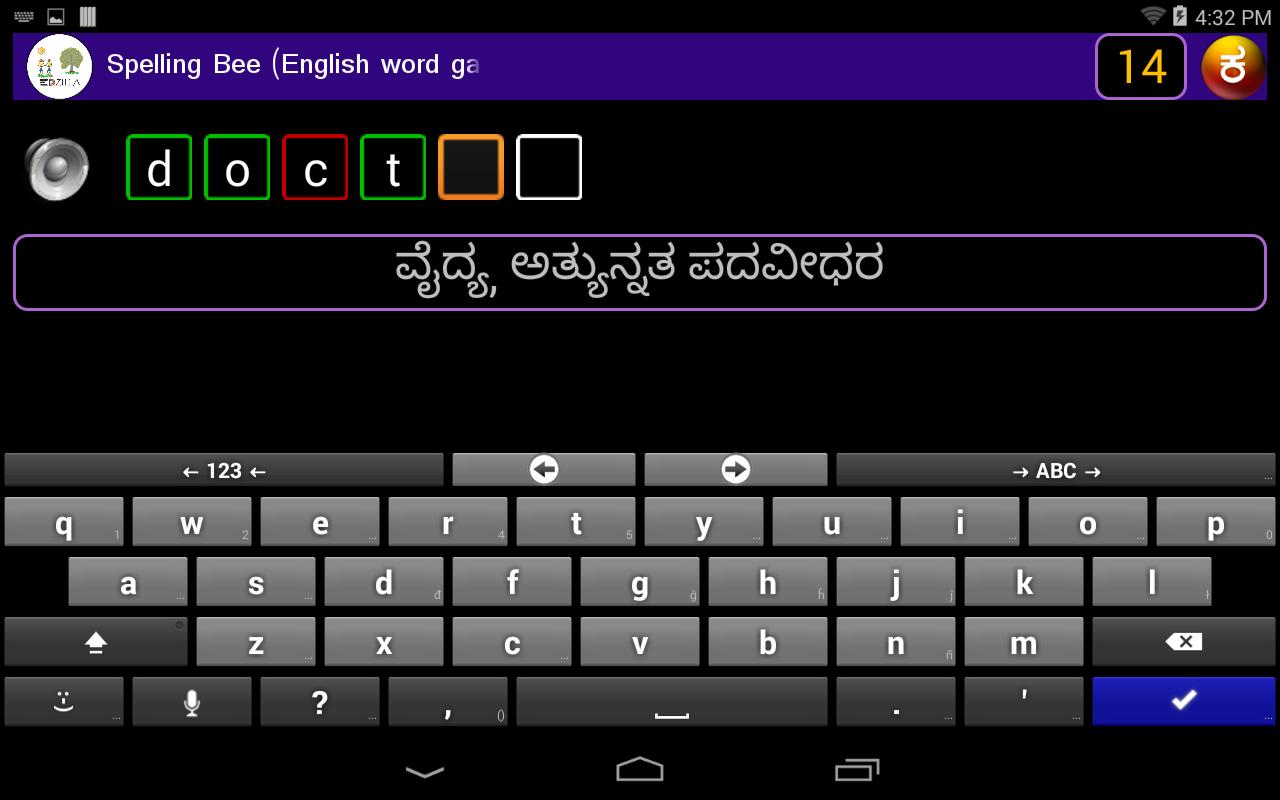 • Still can’t get the word? Try guessing and entering the letters. If there are mistakes, the app will show you the Kannada meaning. Now spell the word and score.