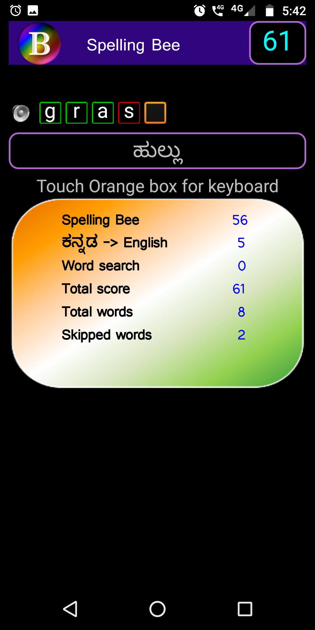 This is a three-in-one game comprising Spelling Bee, Kannada-to-English translation and Word search games.