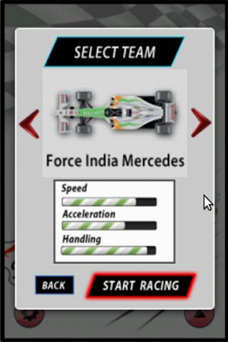 F1 or Formula 1, is the highest class of single seater auto racing. With a number of Grand Prix circuits around the world, the race has become a sensation worldwide. Formula One cars are considered to be the fastest circuit cars in the world, with team like Ferreari, Mercedes Benz, Renault participating. Speeds of 360 kmph are reached at top speed. Engines, Aerodynamics, Suspensions, Tyres are at test at these speeds. F1 Race Day is a tribute to the game of Formula 1, for enthusiasts and fans world wide. The game on android can be played, by choosing a car of your choice and competing on a circuit. The next generation instrument panel, with information on the left, a brake and accelerator just in case you dont want to use the accelerometer. While one can turn the car left write by tilting once device, similar to a real driving experience with a F1 Steering. download to start racing