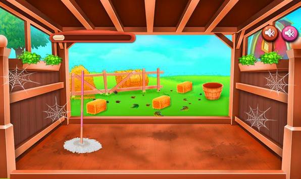 As you've already saw from the beginning there are exactly three animals you will be taking care of, but to be able to look after them, first you have to create for them proper conditions and a suitable environment to settle in. The horse is the one that will start your caretaker challenge. You will have to remove the dirt from the ground, also there is poop everywhere and you need to get rid of it immediately because is smells horrible Don't neglect the spider web that is spread on each corner clean the floor and make sure the walls are spotless. One more thing that is left is choosing the right type of food for this horse