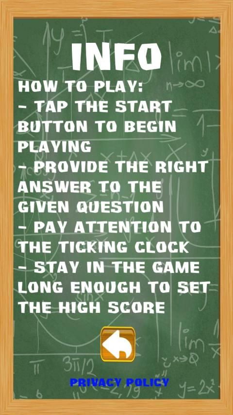 ✔✔✔This is the most sensational way for you in which, you can improve your logical skills and memory. The best part of it is the time limit within which you are to provide the solution to the math problem. Feel the adrenaline rush while you are trying to set the high score. Show the awesome ☃Fast Calculation Game☃ to your friends and boast about how it is entertaining. Yu can even organize a contest among you and the winner will be the one who answers the greatest number of questions and thus reaches the high score. Do not forget that when you start playing all the equations will be easy but as you play they will become harder and harder and you have a time limit for each question. Our advice to you is to be fast. Do not make mistakes because they will slow you down. Then you will not succeed in solving the arithmetic problem while the clock is ticking and you will lose. Download free the popular ☃Fast Calculation Game☃ app on your Android™ device and enter the world of mathematics.