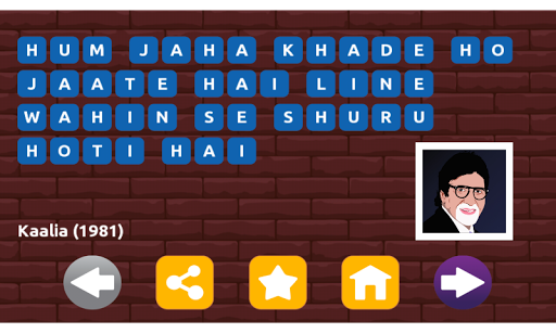 Let us know how you feel about the game by rating it on Play-store. Reviews help us to improve further. If you have any suggestions/corrections or you would like your favorite Movie Quote to be added in the game, just write back to us. Hope you enjoy playing the Filmi Detective.