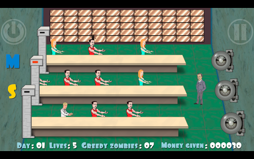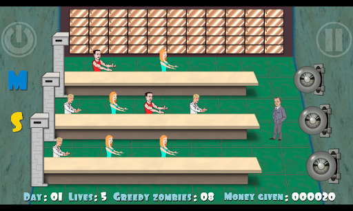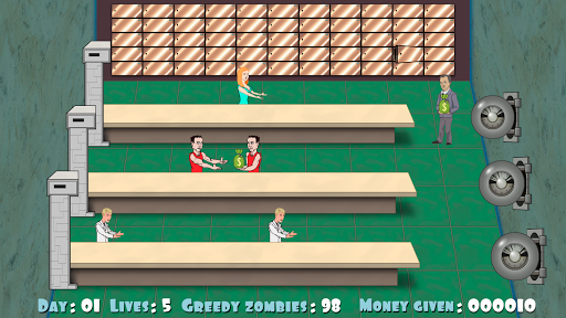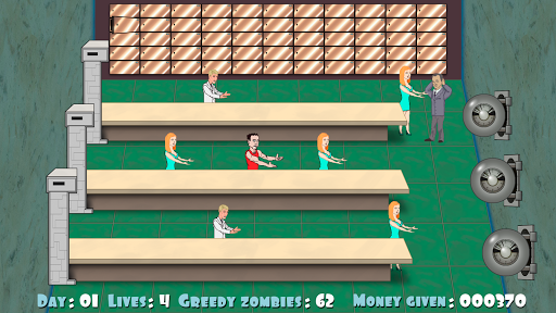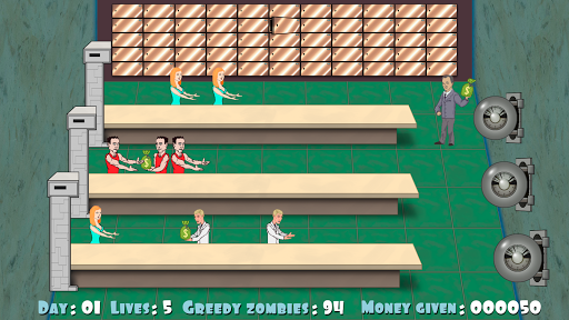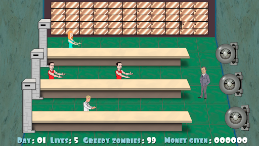 Financier is a joky remake of the legendary game Tapper, but in a modern way. You are surrounded by greedy zombies. The only way not to let them eat you is to throw a bag with money into their hands. Then a pleased greedy zombie is going to leave and let another one take his place. Train your reaction: run up to a necessary safe in time. And don’t miss – each bag is very important! We wish you to be successful and survive in a greedy financial world!