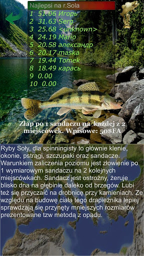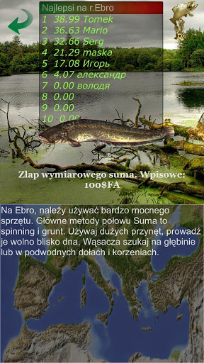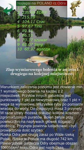 It is a fishing simulator aimed at specific species. The players, by operating their phone and using its motor functions, can achieve good results in the game through a throwing technique suitable for a particular fish species, selecting the appropriate lure and the way it is handled, choosing the right spot as well as the technique the fish is tugged and reeled in. Apart from arcade features, the game offers the base of knowledge on fish species to be found here (preying, sizes and closed seasons, tricks, tips, etc.) as well as on fisheries and baits. The theme of the game is asp. The application has low system requirements and is dedicated for touchscreen smartphones with Android system from version 2.01 (API level6, ARMv6).