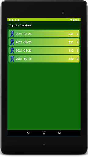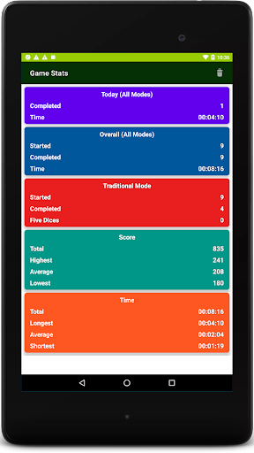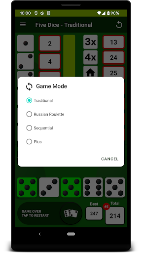 Traditional mode follows the rules of YAHTZEE very closely. Each turn allows up to 3 rolls & there are 13 turns in a game. Tap on the dice you want to keep after each roll & get maximum points by rolling at least 3 of a kind in each of the left scoring categories. If you score at least 63 points on the left, you get a 35 point bonus. Score in 3 of a Kind, 4 of a Kind, Full House, Small Straight, Large Straight, Five Dice & Chance on the right. Score 50 points for your first Five Dice (5 in a row) & a 100 point bonus for every Five Dice after that. Traditional mode has its own leaderboard.