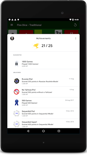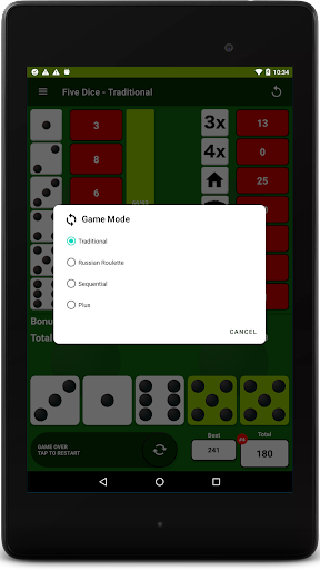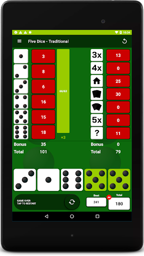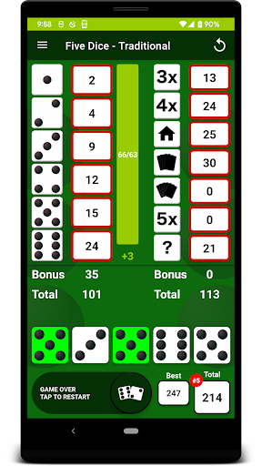 After each roll, all valid scores are highlighted in yellow so you can quickly decide where to apply the results. Where you place the score from each roll is up to you. There are thirteen turns of 3 rolls each per game. After each roll you can choose which dice to keep by touching them, then the remainder will be included in the next roll. At the end of the 3 rolls, you must assign the score before you can move on to the next turn. The first Five Dice is worth 50 points and each subsequent Five Dice will be rewarded with a 100 point bonus. Score 63 or greater on the left side of the score card & get a 35 point bonus.