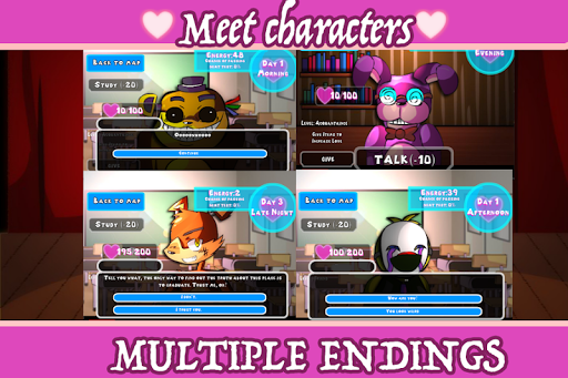 As a student in Jumpscare Academy, you get five days to build up love for your fellow students and your favorite animatronic characters! Each day is a different opportunity to find love! You'll have to talk to them, answer their questions, and give them affection to build up their love for you.
