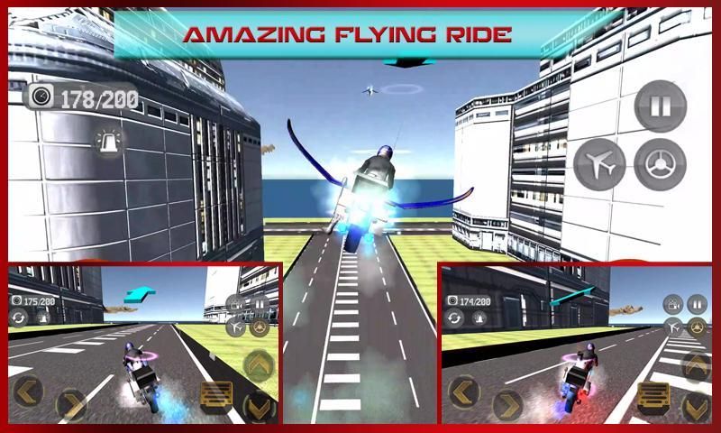 Flying Motorcycle games Simulator is totally different from other flying bike games and flying car racing games. In this game as a hero you're driving a flying moto bike super hero of the world. An awesome mixture of police bike racing games and police motorbike games. You can fly a bike, perform epic stunts, the best mixture of 2 worlds!