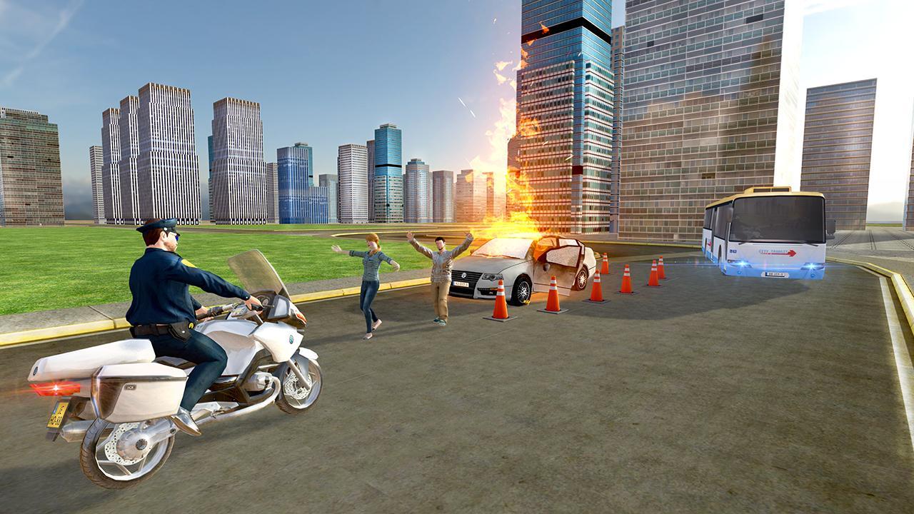 that every day is engaged in the traffic cop. Chase, Catch & Smash Real Gangsters in Extreme flying police bike rider 2016. Play Brave cop thrilling adventure bike chase for a greater cause to eliminate crime threat from city and bring peace in this Grand traffic flying police bike game. Rush through the city traffic while chasing the crooks and smashing criminal bikes and become a traffic police crime city police driver. The police chase adventure takes a new twist. The thrill is incomplete without cops vs robber’s thrilling story in the city of peace. Hero cop! Chase wanted thugs to eliminate crimes. On duty officer is not feeling well. Police car is out of order. Get on the flying police bike and chase down the criminals escaping from even the narrowest ways. Driving fast can make you catch the criminals and send them to jail for the crimes they have committed. Give them a hard time for their grave sins. Do not bang into the innocents and thrash into untouched cars. Bike chase and car smashing is going to be a lot of fun. Test your driving skills in this exciting simulation game as a brave cop to protect your city from crime.