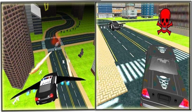 Drive and fly the flying police car to chase Robbers and Criminals. With Free Flying Police Car Simulator get the thrilling cop car driving experience! Test your police flying airplane pilot skills and cop car driving ability at the same time. Fly your plane around the San Andreas city crime to chase down criminals and bank robbers, Do aerial police truck stunts and drifts as a real policeman / police car driver in this flying police simulator. .Play as a real cop driver, flying police cars rather than driving in San Andreas or Miami city for chasing criminals in flying speed sports cars. Enemy mafia gang is attacking the city. Be a great flying car pilot, turn on siren and lock on target, Press button to launch missile, bombard and takedown criminals. Be the flying police and chase down the mafia gangs racing and flying cars. Chase Futuristic criminal flying car and be the best police in Flying Police Car: Police Chase, newest edition to the clash of crime games , flying police simualtor and futuristic police car racing games