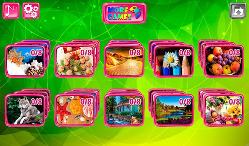 In the game "Fold jigsaw" you will be able to collect 80 beautiful pictures which are divided into 10 different categories. Each picture can consist of 56 or 100 pieces of a puzzle, it can be chosen in game settings. Also, there it is possible to choose the background hint to the picture which will facilitate folding of this puzzle. Of course, we did not forget and about game preservation, at any time it is possible to press the button in the form of a diskette and game will remain next time to continue since that moment on which stopped. You can even arrange competitions, on the speed of collecting puzzles, and the timer of time will help you to record the best result. During assembly of a puzzle it is always possible to look at the picture which you collect now to put a puzzle piece on the right place. And pleasant music will help to relax and derive pleasure from game.