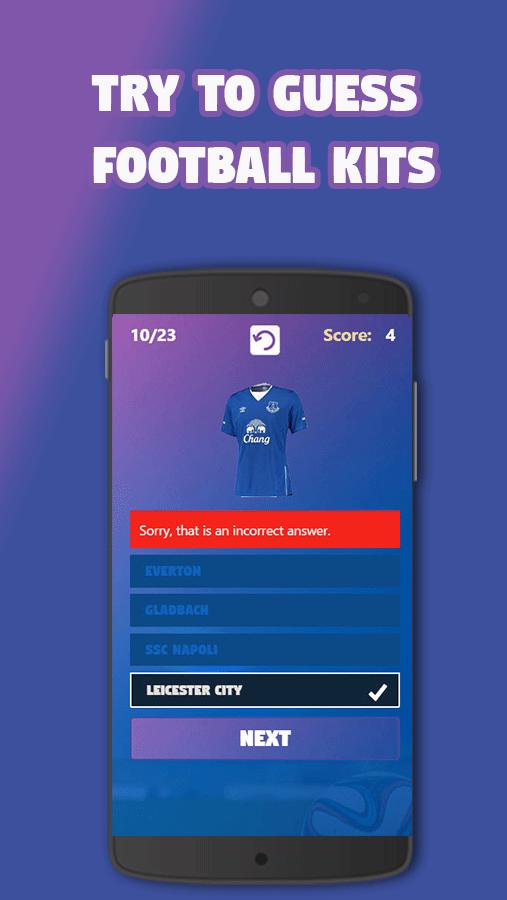 + The next screen you will got the first question. Football question about Kits of a football Club.