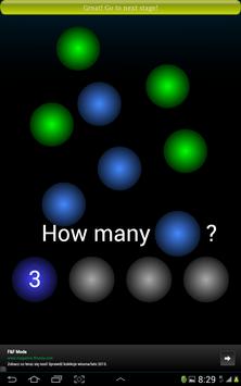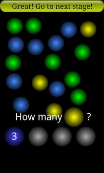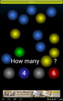 Free Mind Game is played in rounds. In each round the game will briefly show you several circles with different colors. After about a second the circles will disappear and you will be asked how many circles with selected color there were. If you answer correctly, you will advance to next round with more circles. If you make a mistake, next time the number of circles remain the same or will be decreased. You will have 3 attempts. After third mistake game will finish and your result will be presented.