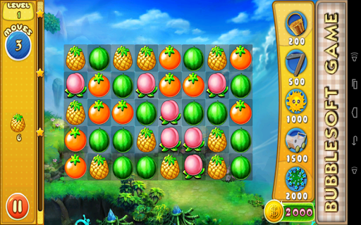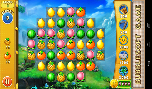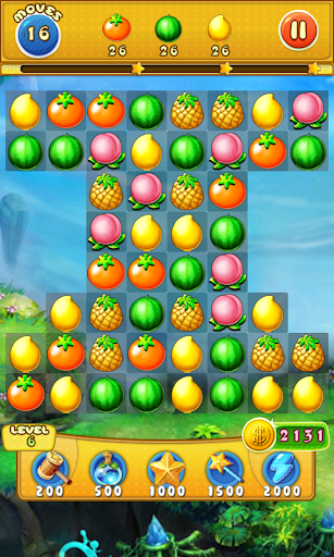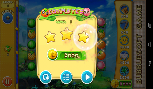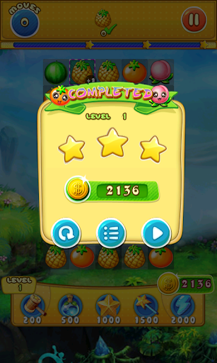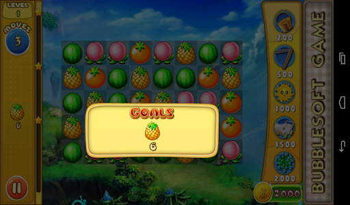 1.Switch the adjacent fruits,Make 3 or more with the same type together to eliminate them.Collect cute crops mixed with fruits and flowers showed on the left to win the levels before you run out of moves.