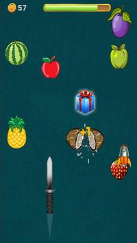 Throw the knife from below to cut the falling fruit and do not let it fall down and avoid hit bombs .