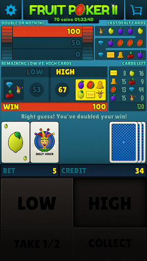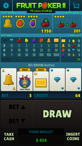 Fruit Poker II is the slot machine with fruity cards. Rules are simple, you must have so many same symbols as possible, maximum 5. There are bonuses for 2x cherry or 4x other symbols. You can double up your win by guessing symbol on the hidden card. You get 200 coins after installation and 50 coins every 12 hours. The maximum​ bet is 1.000.000 and maximum win is 500.000.000. Have fun with Fruit Poker II.