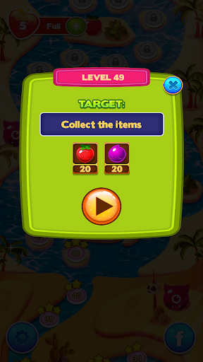 Fruit Splash Journey is an arcade mode gameplay with 100 mission to completed. Little Fruitos starting to leave his farm and making a journey to arctic. Help him to complete every mission so he can advances to the next place.