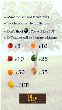 Fruits and bomb are moving on the screen, Target the fruit with gun and shoot.