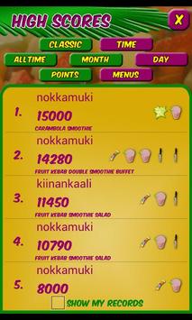 Fruit Kebab features two game play modes: Classic and Time. You can post your high scores and highest scoring menus online.