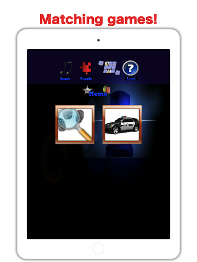 Another amazingly cool feature to the Police Games For Kids Free: Police Car π Cop Games makes it even more awesome then just matching your little cop must find the icons that link for their match choices! And when they do make a linked match the little police officer games shows them the link. This important element, and the matching itself, provides a real educational bonus and playing Cop Games For Kids Free also promotes: