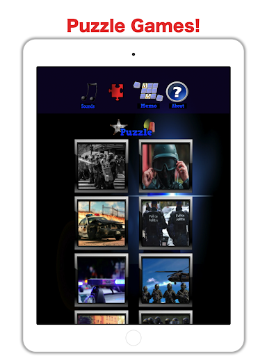 π§© 6 Real, high quality puzzles for 3 difficulty level with helicopter, police cars, police officer and motorcycle