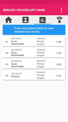 Users have the option to send e-mails to the game developer and share their custom databases prepared for TOEFL, GRE, GMAT, IELTS or other proficiency exams with translations or descriptions (at least 500 words) via the personal settings and special tests page of the game. Thus both database owners and other users can play English Vocabulary Game with those new special and custom words.