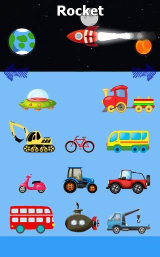 UFO, Rocket, Train, Bulldozer, Bike, School Bus, Motorbike, Tractor, Jeep, Bus, Submarine, Tow Truck