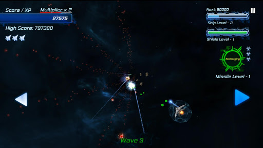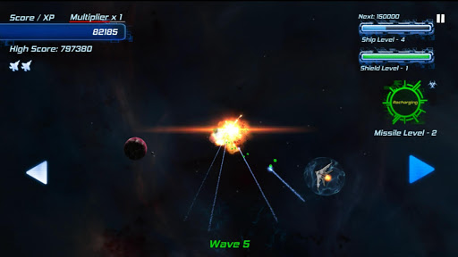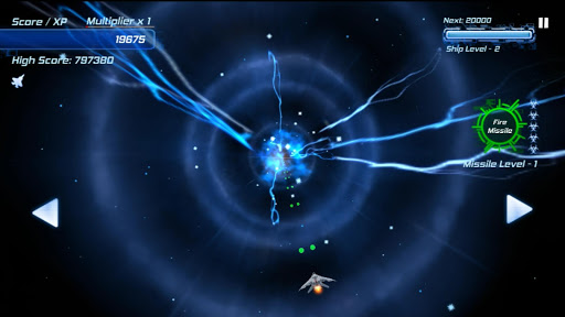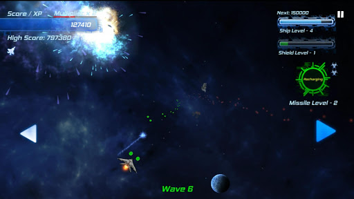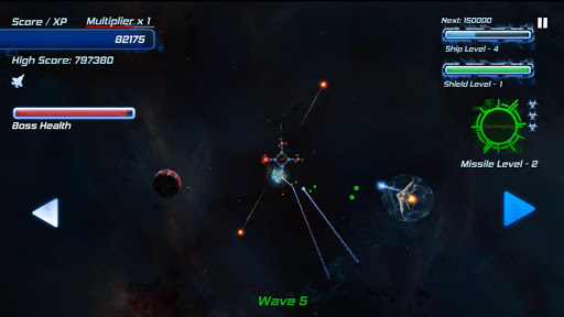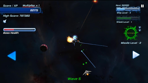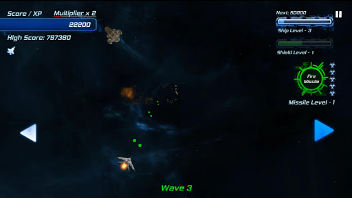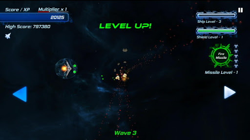Your score also doubles as your experience points. Your ship will level up as your points increase, giving you more firepower, shields, and guided missiles to help you along the way. Can you survive long enough to beat your high score?