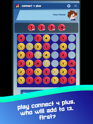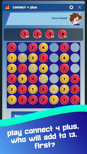Connect 4 Plus --- If you have enjoyed playing Connect 4 or Four In A Row growing up as a child, now is the time to play Connect 4 plus on Game of Numbers because a new layer of numbers on top has been added. There is an additional dimension to consider while dropping in the chips. The goal is to have your row add to 13 first to win against your friends with strategy.
