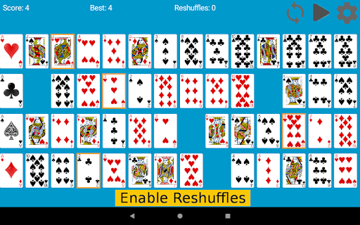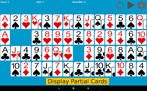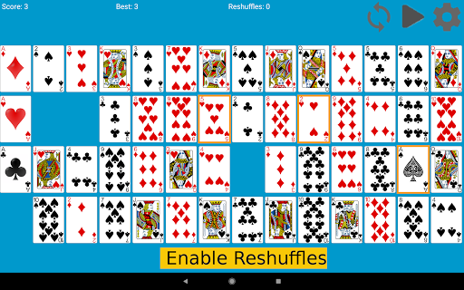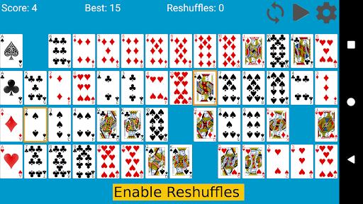 The game will be over before the solitaire is solved if there are no more moves left. Then, you have two options: 1. Start a new game or 2. "Reshuffle" if you want to continue the same game with the Reshuffle option enabled. This will reshuffle all cards that are not yet sorted. Reshuffle will not work if there are still available moves left.