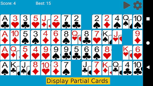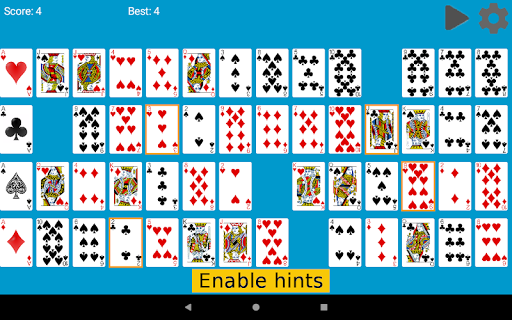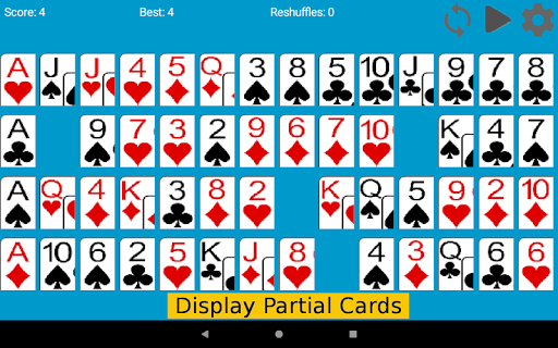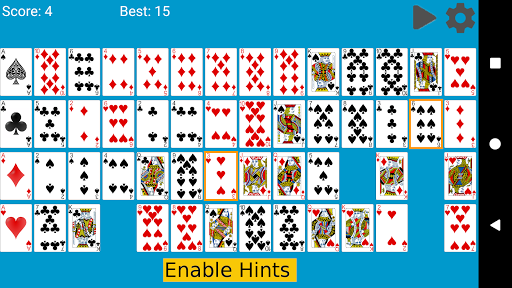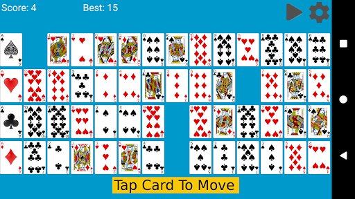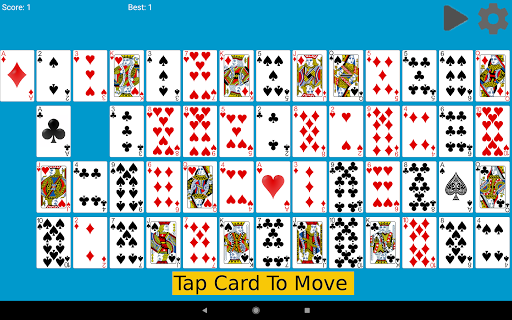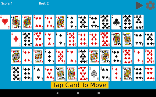 At the beginning of the game, the cards are shuffled randomly and laid out on the table evenly in four rows. The first position on the left is a “gap” or an empty spot. At all times, there are four gaps in the game.