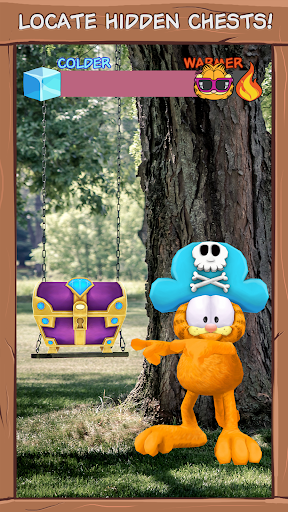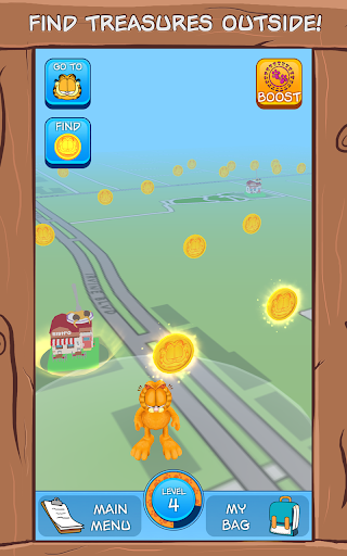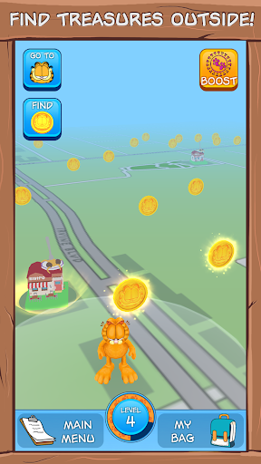 Augmented reality is a new technology that allows for you to experience parts of the game in the real world! While playing Garfield GO, you can use your phone’s camera to look around and find Garfield pointing to a chest on the sidewalk or in a park. You could find him standing on your desk, sitting on a friend’s lap or even hanging out next to one of your pets! You’ll never know where Garfield will turn up next!
