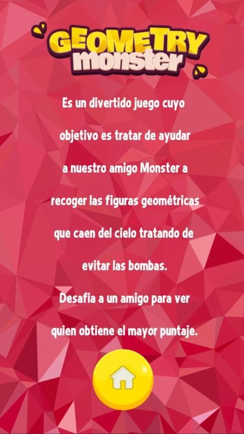 Geometry Monster es un divertido e interminable juego hiper casual donde tienes que ayudar a nuestro amigo Monster a recoger las formas geométricas que caen del cielo tratando de evitar las bombas, con una dificultad progresivamente creciente.