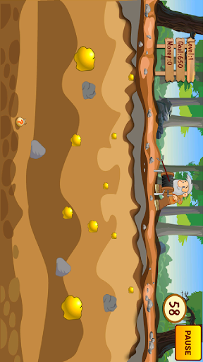 2. Your claw will swing back and forth, tap screen to rise up, once it has grabbed something it will rise it up. Heavy objects like rocks and large pieces of gold will be harder to reel up. Grab bags contain random amounts of money, a strength power-up, or a stick of dynamite. Between levels you can buy items that can help you.