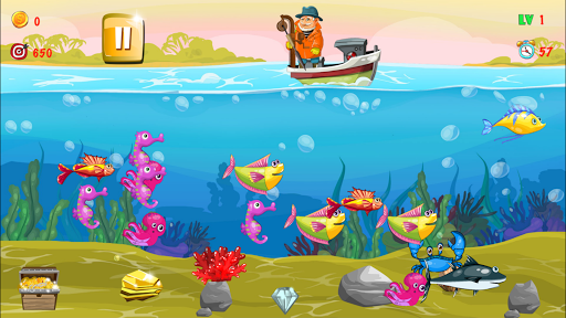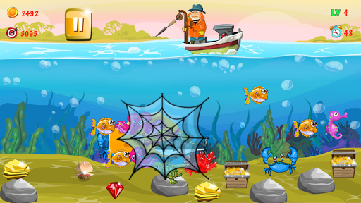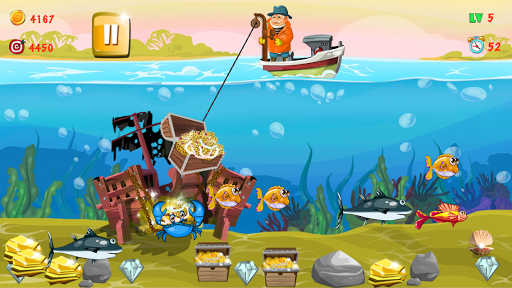 Fishing, gold miner, gold rush is a very simple game, but requires you have the dexterity to hit the fish are swimming raven, sometimes you get the shipwreck containing plenty of Gold, Diamonds, Gems and Treasures, your duties is to catch fish and gold as much as possible to be able to pass level goal.