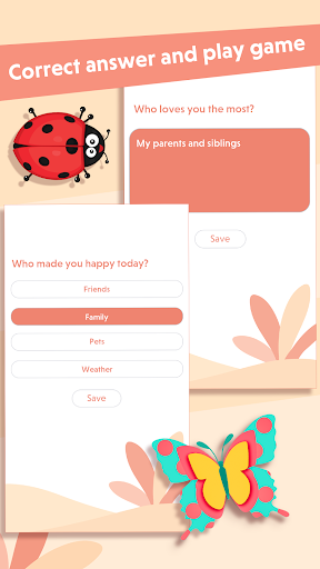 Our gratitude journal game is extremely simple. Upon launching the game after installation, you’ll see a screen that will allow you to start the game. Start the game and you’ll be asked a question. Select an answer from the given choices and continue with the game. A beautiful butterfly appears to be flapping its wings as it passes through a lush garden. Next, you’ll begin to see a few bugs on the screen that are floating about. You need to move the butterfly around the screen so it doesn’t touch the bugs – if the butterfly touches three bugs, the game is over.