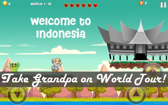 In this classic platformer adventure game, Grandpa is old & grumpy and now he wishes to travel the world like when he was young. Your job is to help him in his jungle adventure. There are many countries and landscapes to visit and explore in this platform game starting from mystic Nepal's beautiful nature, Brazil, Indonesia and so on.