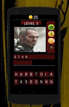 Thrones. using imaginative and power of the notes, The more strictly and quickly you respond, the better the score you’ll have to compete against friends worldwide fame on Game Center! Can you guess all the character TV challenge your friends who watched the serie too.. Many characters are known like BRONN, Jon Snow, GILLY ,Sansa Stark,Ramsay Bolton. the game is very difficult and fun, you just need to guess the